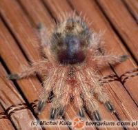 Dość ładnie ubarwiony ptasznik. Tarczka grzbietowa i nasada kłów jadowych brązowo szare. Odnóża podobne, mocno owłosione. Odwłok ciemny, bardzo gęsto porośnięty czerwono pomarańczowymi, długimi włoskami. Na odwłoku znajduje się złotawa plama, tzw. lusterko. Dorosłe samce i samice całkowicie różnią się od siebie ubarwieniem. Dojrzałe samce są czerwono pomarańczowe. | |